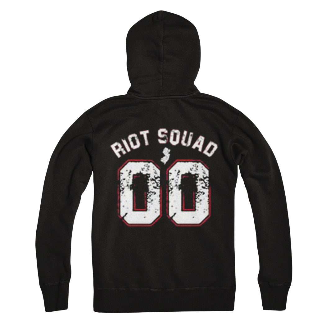 Nora black hoodie shown from the back with bold white "RIOT SQUAD" lettering above a large distressed 00. This pullover has a hood, long sleeves, and is designed for comfort and style.