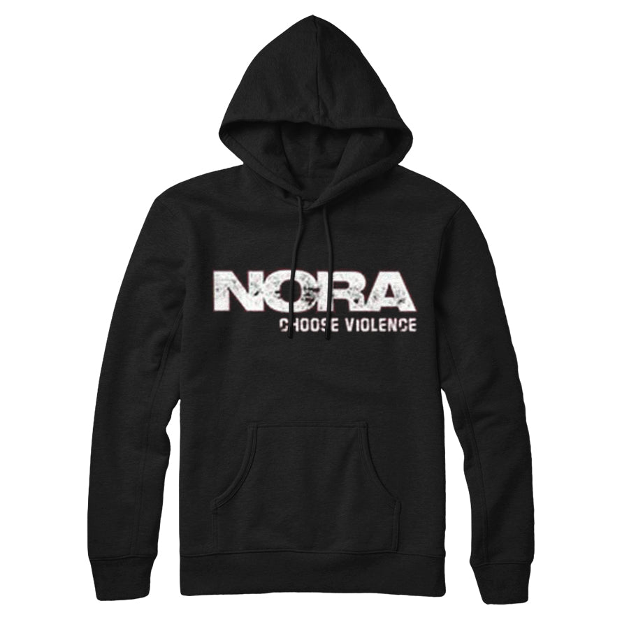 A black hooded Nora sweatshirt featuring "NORA" in large white distressed letters and "CHOOSE VIOLENCE" in smaller text on the front—a bold, graphic addition to your pullover collection.